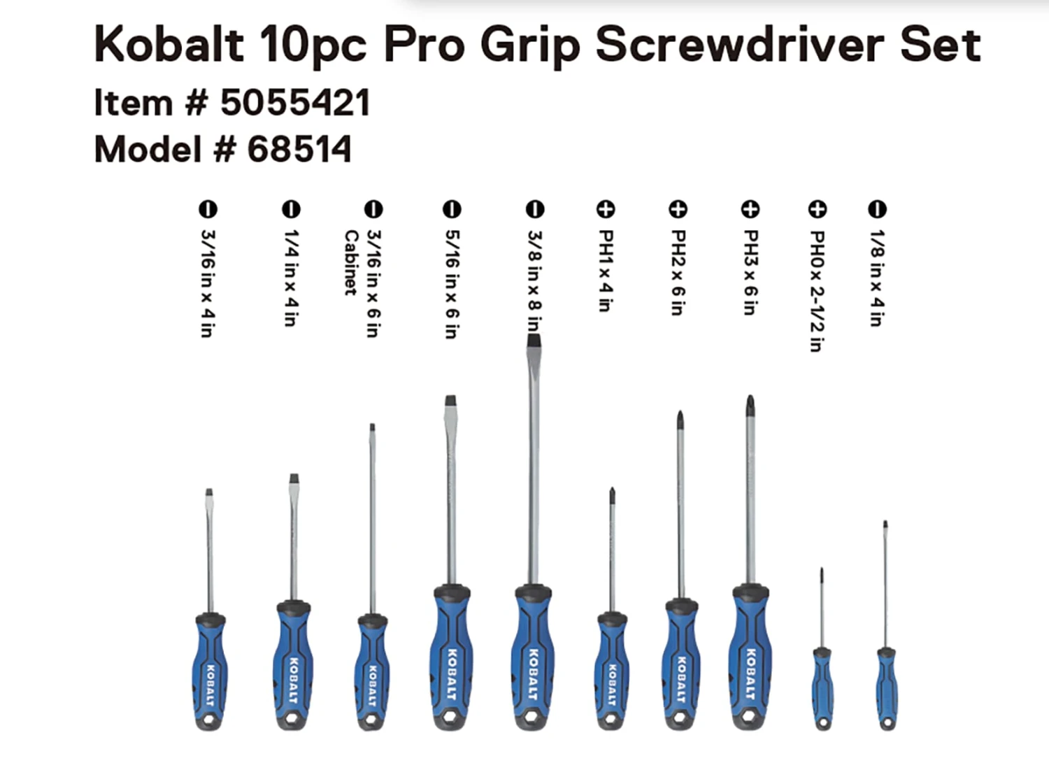 Includes: Phillips: #1x4in, #2x6in, #3x6in, #0x2-1/2in, Slotted: 3/8inx8in, 1/8inx4in, 3/16inx4in, 3/16inx6in, Cabinet:1/4nx4in, 5/16inx6in