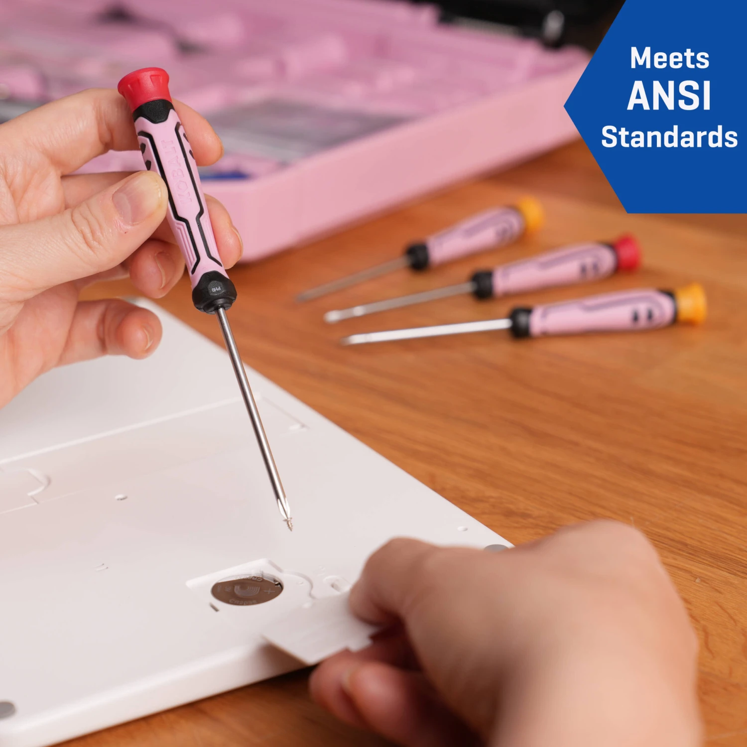 Pink Precision Screwdrivers feature a quick turn endcap, including 4 sizes: Phillips: PH0, PH00, Slotted: 1/8in, 3/32in