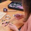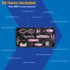 Set Includes: 10oz Fiberglass Hammer, Mini Diagonal Pliers, Mini Long Nose Pliers, 6in Adjustable Wrench, 12ft Tape Measure, Utility Knife and 3 Blades, Bottle Opener, Magnetic Pocket Level, 6-in-1 Screwdriver, 2pc Precision Screwdriver, 5.5in Scissors