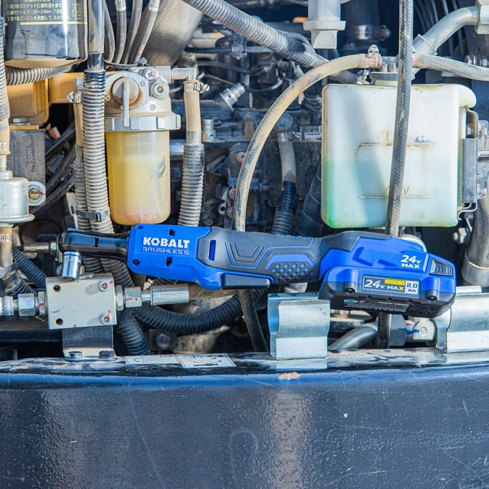The Next Generation Kobalt cordless ratchet reduces the size up to 20%, reduces weight over 30%, and increases the speed by up to 60%. The new compact tool size and low profile ratchet head makes this product perfect for automotive, electrical, and HVAC applications. This lightweight ratchet delivers up to 45 ft-lb of torque and up to 400 RPM to quickly drive fasteners. The ratchet head features a pin detent anvil which provides easy socket changes for maximum productivity. The ergonomic design allows for multiple grip positions for getting into difficult-to-reach and tight spaces. The variable-speed trigger puts the user in control of the fastener speed. Improved LED lighting helps the user see fasteners in tight work areas. Engineered for the toughest conditions where solvents and chemicals are commonly used, such as automotive repair.