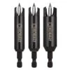 Self-centering pin prevents walking. Designed for use with hand held drill drivers. Precision cutting blades for accurate, tapered wood plugs. Set includes 3 sizes: 5/16 inch, 3/8 inch, and 1/2 inch.