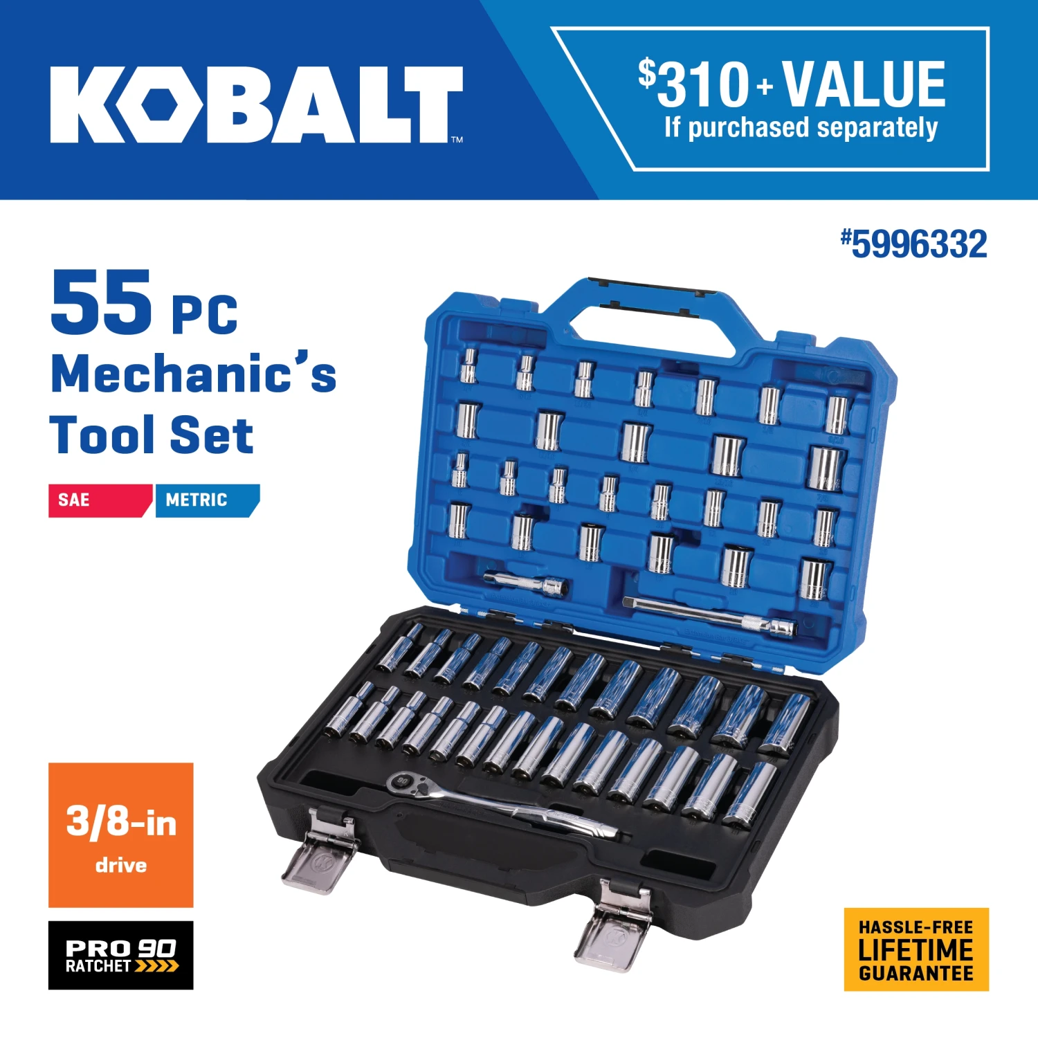 Kobalt’s dedicated 3/8-inch drive mechanic’s tool set includes a mix of fifty (50) deep and shallow, metric and SAE sockets
