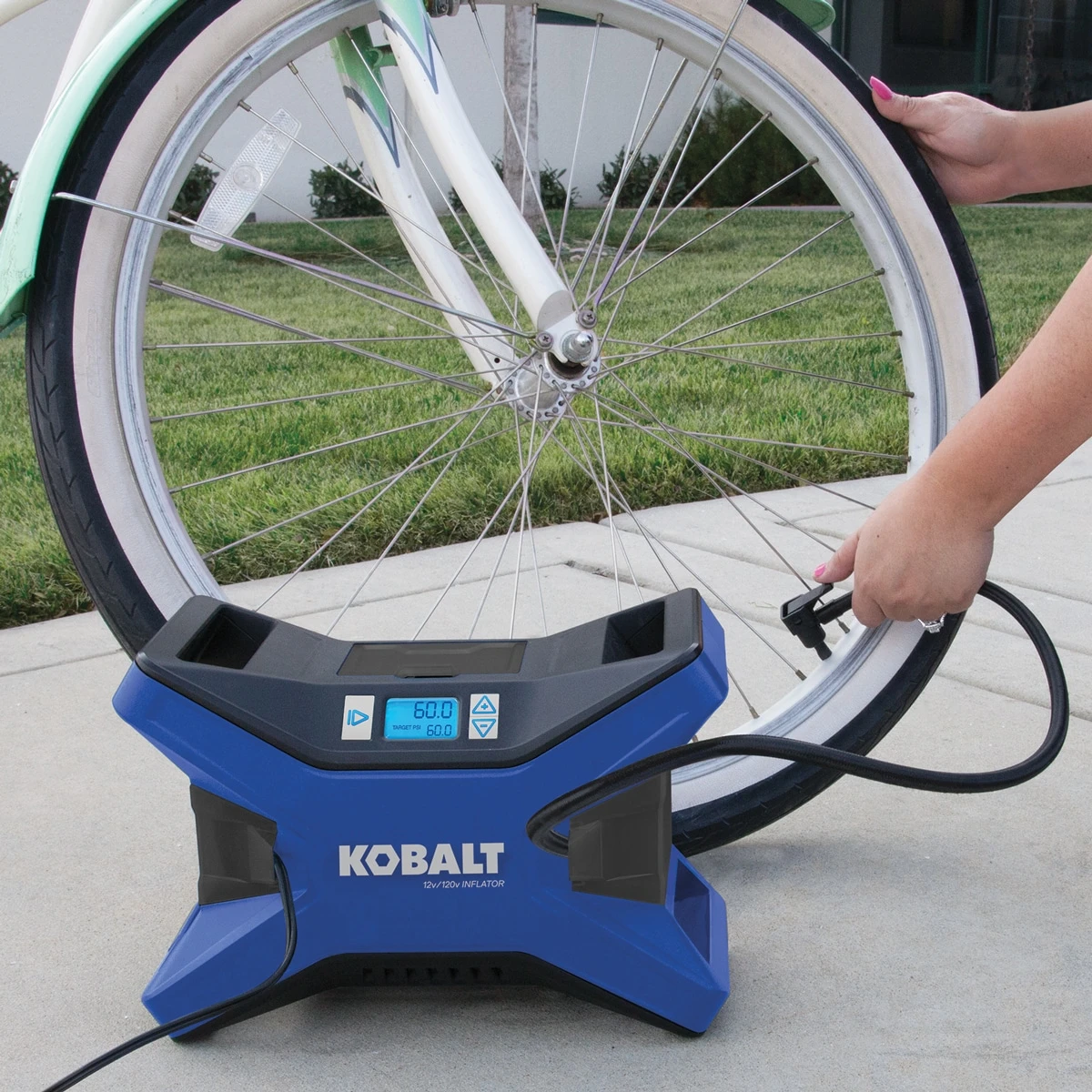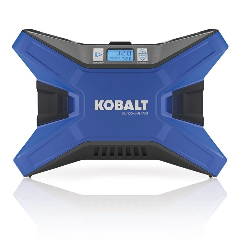 KOBALT 12 Volt/120 Volt dual power inflator provides up to 120-PSI and is the perfect size to keep in your car, and quickly inflates items like car, bike and ATV tires, air mattresses and beach toys