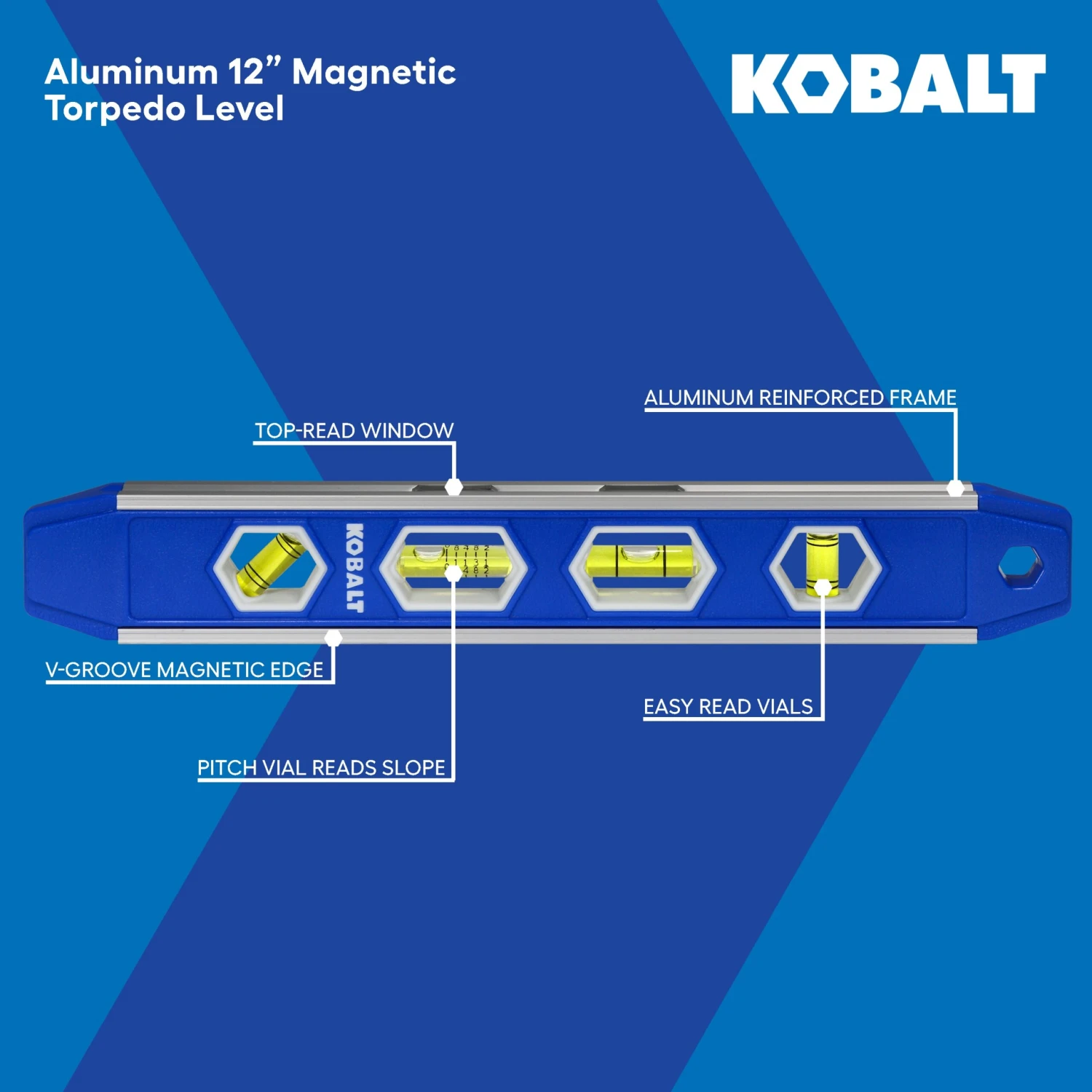Torpedo level with durable aluminum reinforced frame.