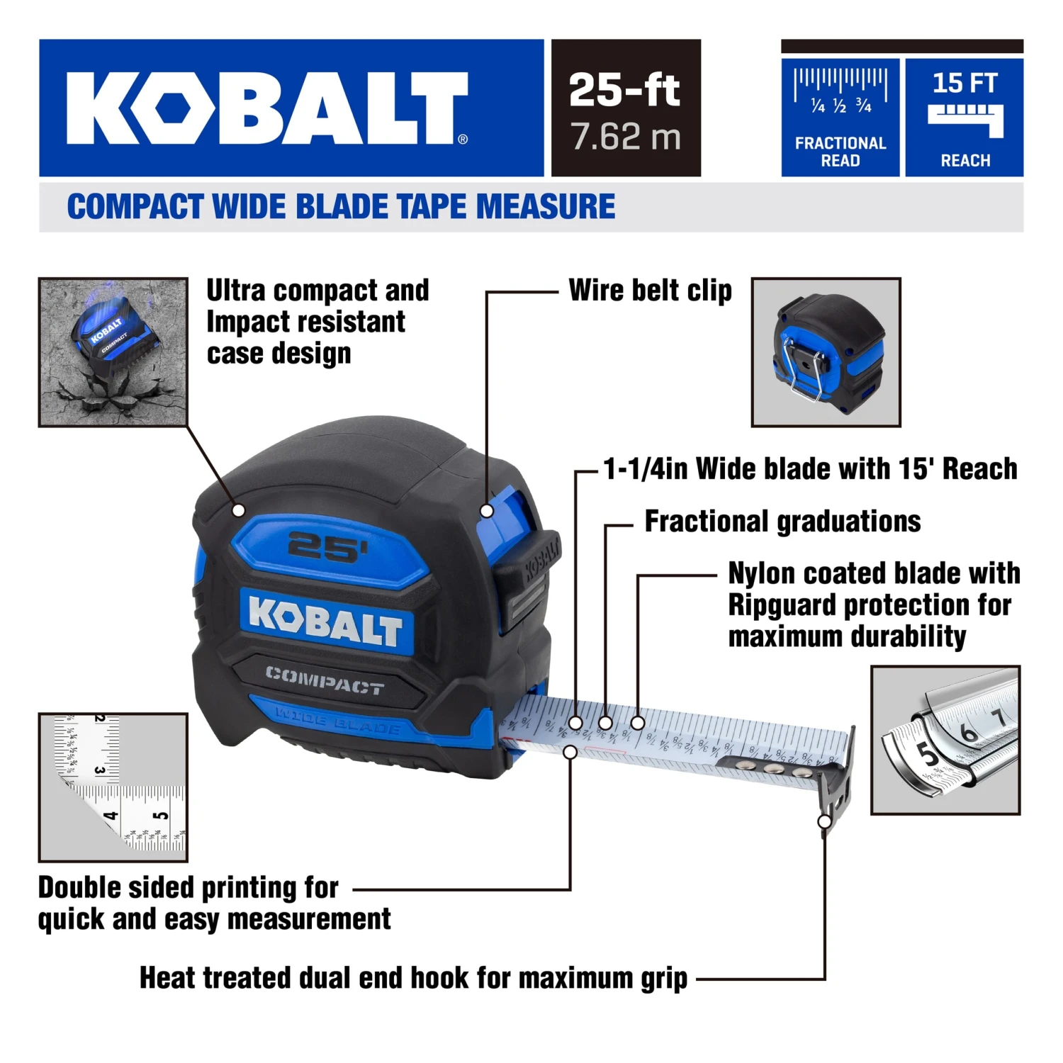 Kobalt wide blade tape measures are the most compact design wide blade tape measures in it’s class. The wide blade allows for a 15ft reach and 12ft of standout. It also comes equipped with a white non glare blade and backside printing for precise measurements in any environment.