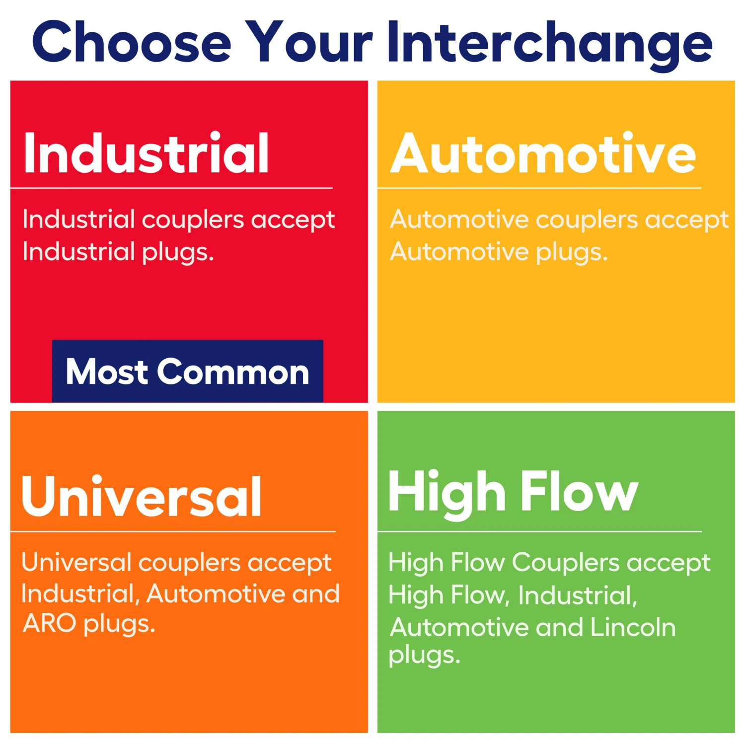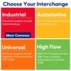 The high-flow coupler works seamlessly with High Flow (V), Industrial (I/M), Automotive (T), ARO (A), Lincoln (L), and Universal (U) style plugs, providing versatile connectivity