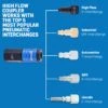 The push-to-connect system allows for fast attachment; simply pull back the coupler collar for a quick release, facilitating seamless operation