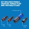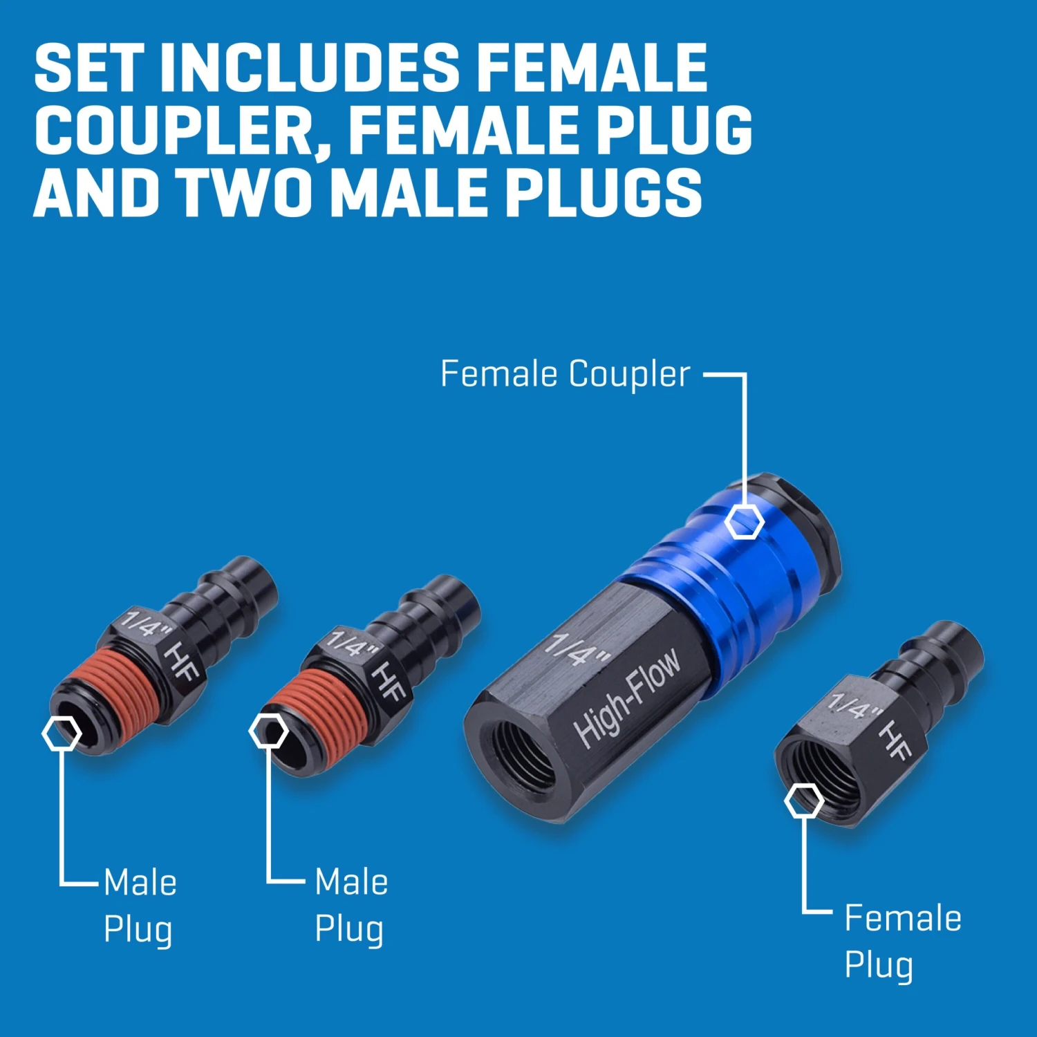Kit includes (1) 1/4-in female coupler, (1) 1/4-in female plug, and (2) 1/4-in male plugs for versatile use with various air tools and compressors