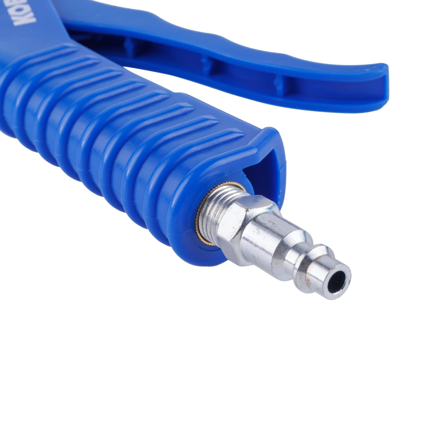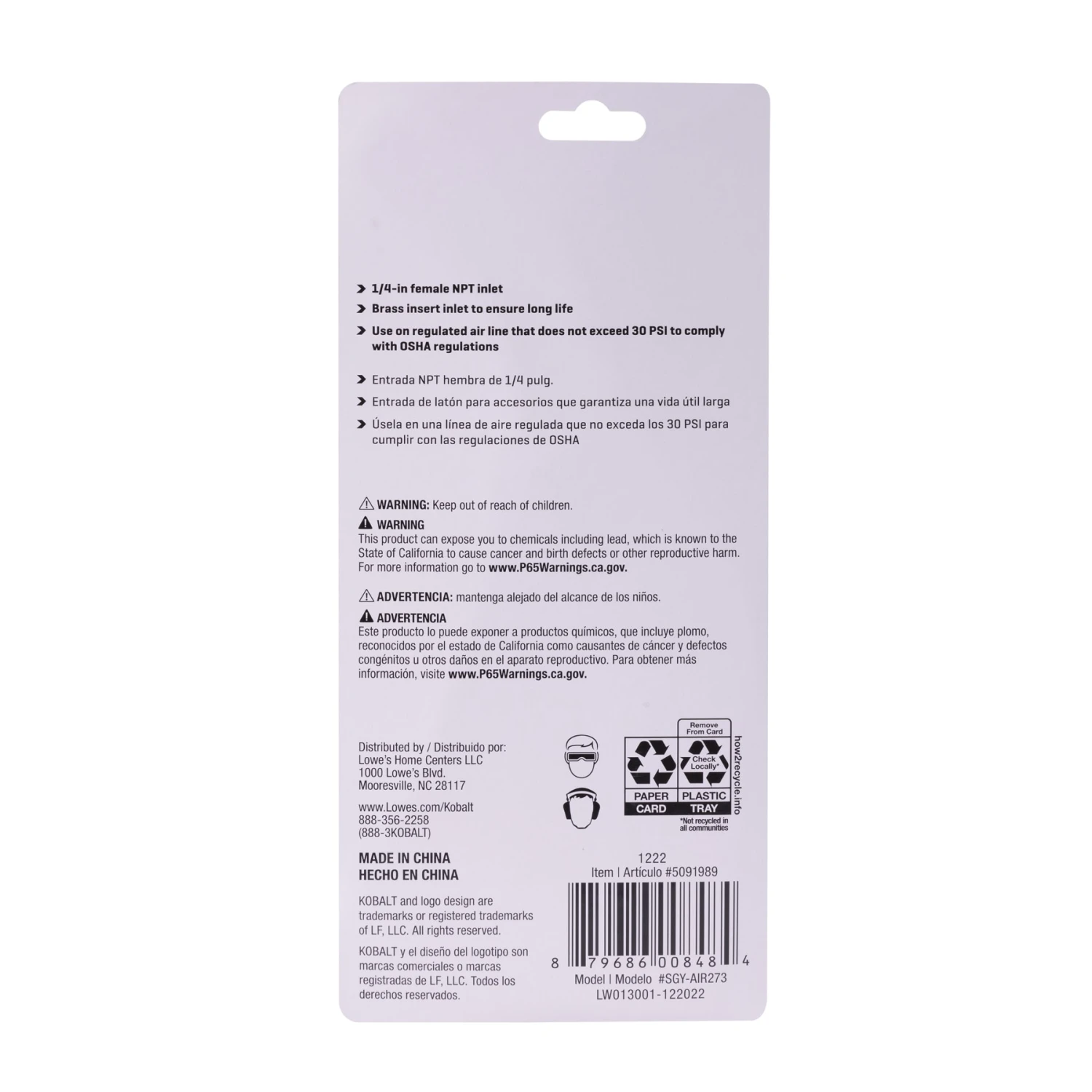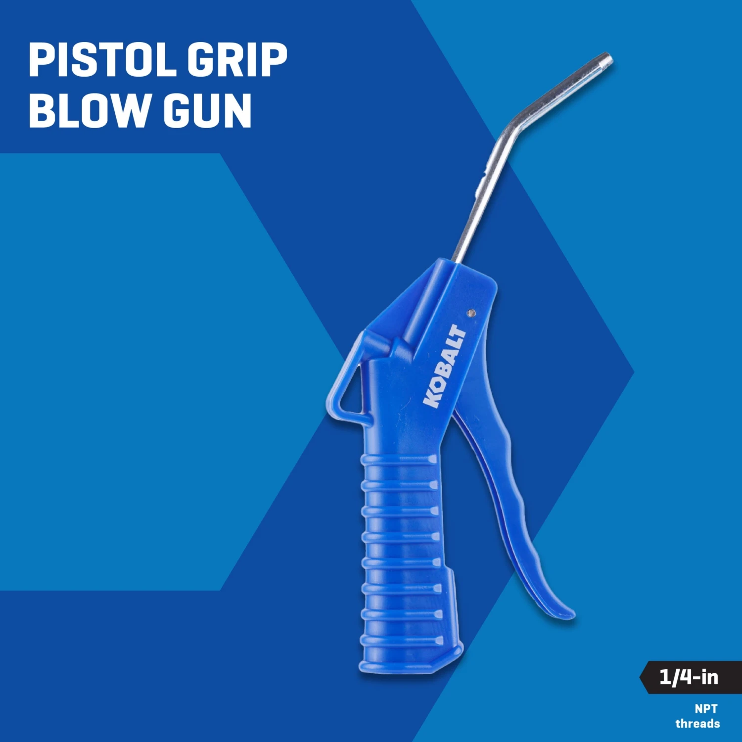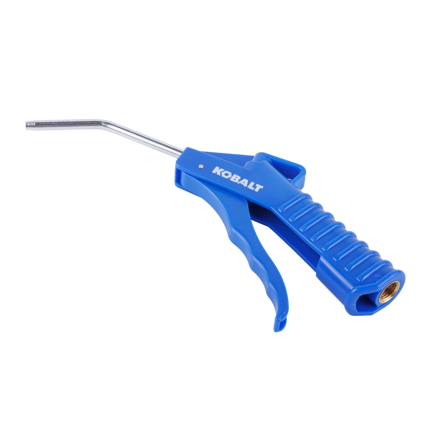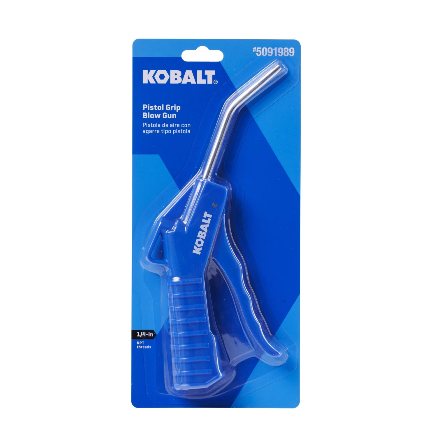 The Kobalt Pistol Grip Blow Gun has a brass 1/4-in NPT brass inlet for long-lasting durability and performance. With a comfortable pistol grip design, it’s easy to use for extended periods of time without causing discomfort or fatigue – perfect for blowing dust and debris off your workbench or cleaning up your garage!