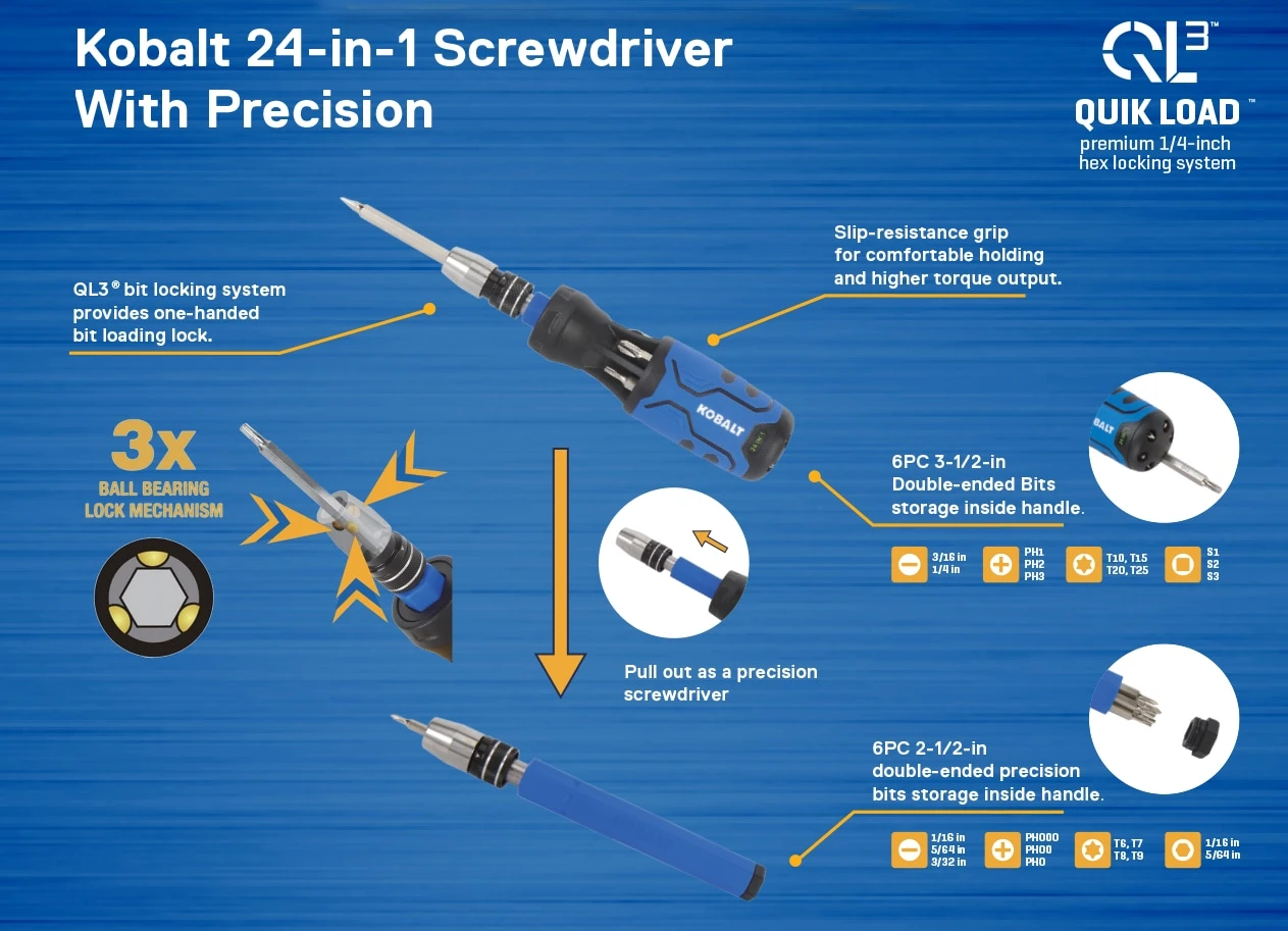 Kobalt QL3 24-in-1 Screwdriver W/Precision 14 -Piece 2-in Multi-Bit Combination Tip Screwdriver Set
