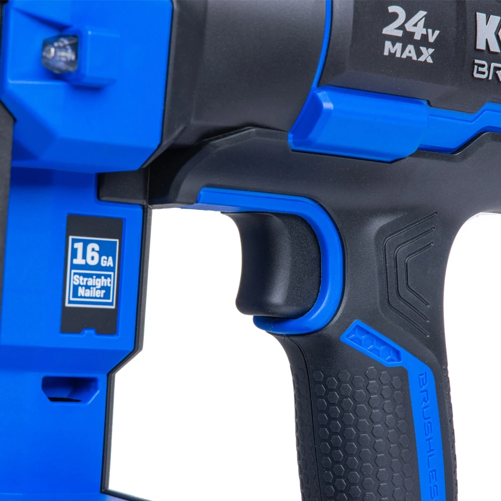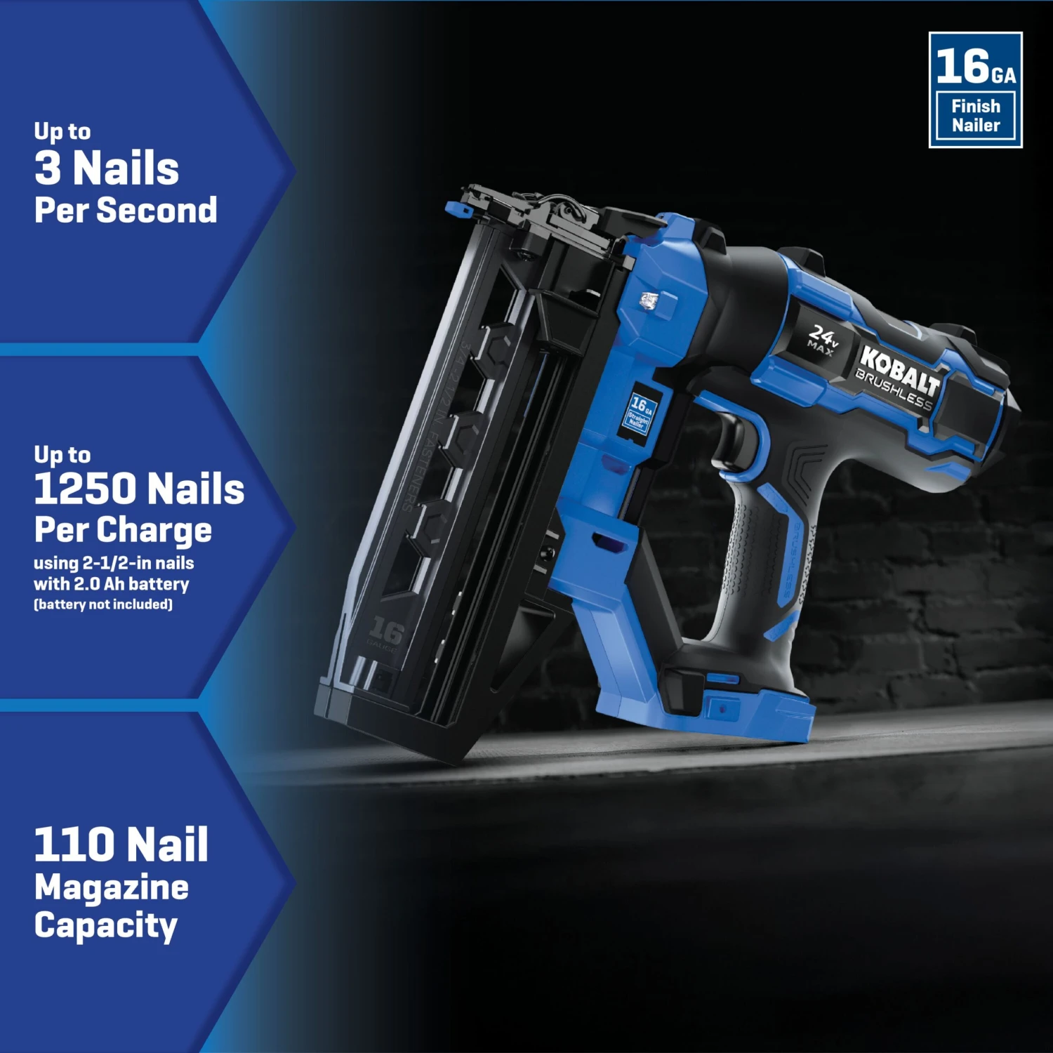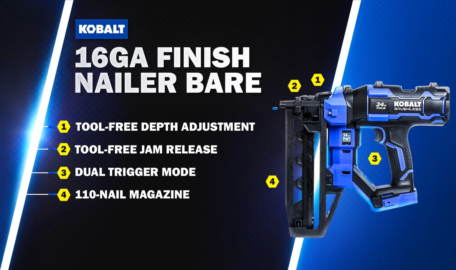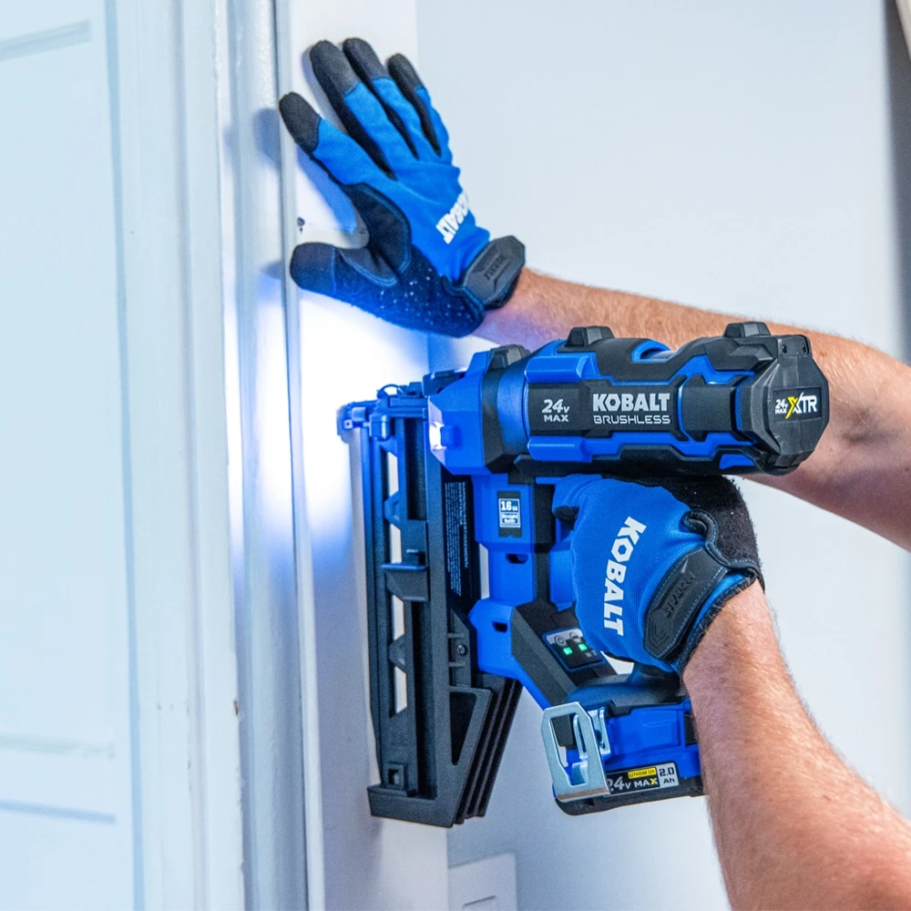 The Kobalt XTR 16-Ga Straight Finish Nailer is the perfect tool for most applications such as residential trim work, cabinetry, furniture, and similar finishing applications. This tool is equipped with a pre-charged internal gas chamber to drive a piston which gives the user a similar feel to traditional pneumatic nail gun performance while eliminating the pain point of dragging an air compressor and hose around the jobsite. The XTR nailer delivers repeatable depth of drive due to the nearly instant reload technology, so the user does not experience improperly sunk nails due to low air compressor lag. The pre-charged gas system provides instant nail delivery after the trigger is pulled. The 16-Ga nailer is equipped with an electronic control panel that allows the user to easily turn the tool ON with the touch of the power button and offers both sequential or contact actuation (bump) mode using the control panel. This cordless nailer delivers on all the features you would expect from a premium performance nailer including the ability to accept 3/4-in to 2-1/2-in long straight finish nails, 110 nail magazine capacity, tool-free drive depth adjustment, dry-fire lockout, tool-free jam clearing mechanism, magazine site window, dual LED worklights and no-mar pads to protect the workpiece. All part of the 85+ Kobalt 24V Max family of tools.